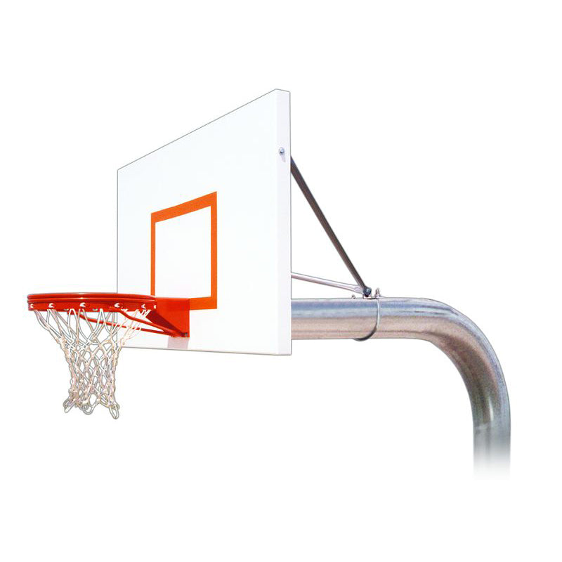 The telescoping backboard attachment allows extension up to 78 inches, while dual 1-inch round tubular braces support the top corners of the backboard, distributing load directly into the pole for maximum strength.