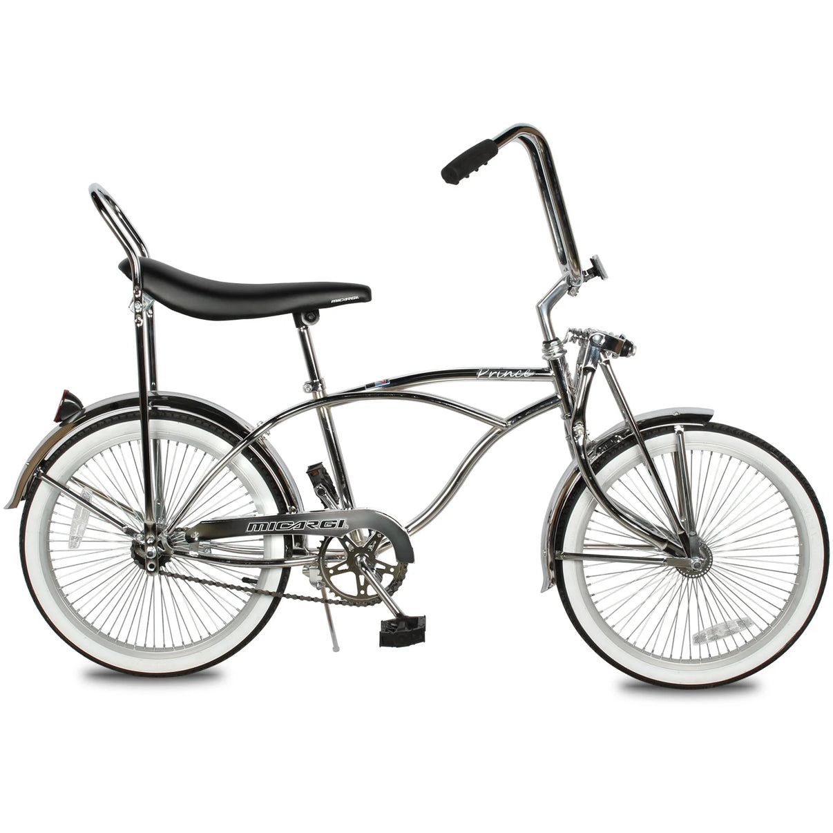 The Micargi Prince low rider bike captures the spirit of classic hi-rise bicycles with modern reliability. Its chrome finish and springer fork make it a standout wherever it rolls. The single-speed coaster brake setup keeps riding smooth and easy. A comfortable banana seat and upright bars make cruising relaxed and enjoyable. Durable steel components ensure this bike is built to last. If you want a low rider that blends vintage attitude with everyday rideability, the Prince delivers.