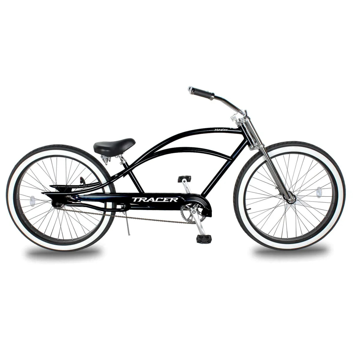 The Tracer Master 29" Chopper Stretch Beach Cruiser Bike is built for riders who want a bold look with relaxed, effortless performance. Featuring an oversized Hi-ten steel stretch frame and massive 29"x3.0 fat tires, this cruiser delivers a smooth, stable ride with undeniable street presence. Its single-speed drivetrain and classic coaster brake keep things simple and low maintenance, making it ideal for laid-back cruising. A spring-loaded saddle and upright riding position add comfort for longer rides. Whether you’re rolling the boardwalk, neighborhood streets, or bike paths, this chopper-style cruiser is designed to turn heads while keeping the ride easy and enjoyable.