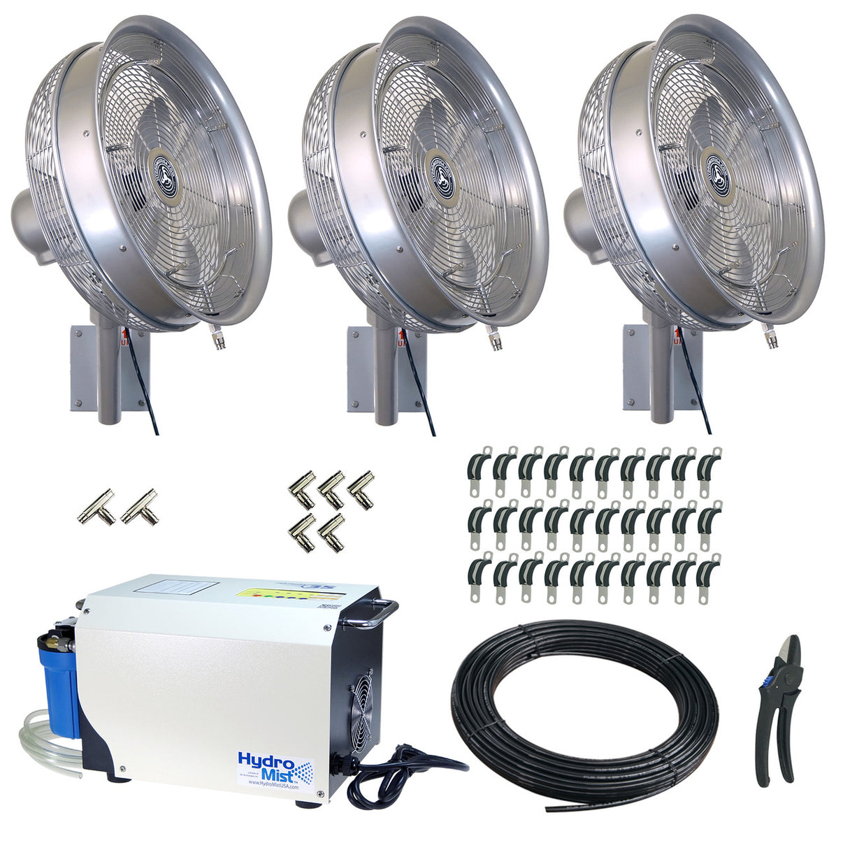 The Hydro Mist DIY 3-18" Mist Fan Package with Pro 35 Pump is a compact, high-performance cooling solution for patios, porches, small outdoor spaces, and residential areas. This package includes three 18-inch fans with three-speed control and oscillation to cover wide zones effectively. The Pro 35 pump delivers up to 1000 PSI to feed fine mist through 3/8" high-pressure tubing, creating an evaporative cooling effect that quickly reduces ambient temperatures. Wall brackets and mounting hardware are included for easy installation, and protective fan covers are provided to keep the system in top condition. Available in multiple color options, this system combines efficiency, durability, and versatility. Ideal for homeowners, facilities managers, and small commercial applications.