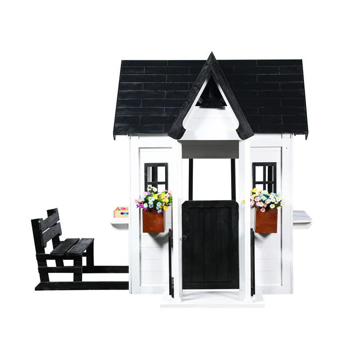 The 2MamaBees Oceano Playhouse offers a Victorian-inspired space for children to explore, create, and imagine. Its elegant black and white design makes it a striking addition to any backyard or indoor playroom. Featuring a built-in kitchen, wooden play food, cedar window boxes, and a versatile black window bench, this playhouse encourages creative role-play, gardening, and social interaction. Crafted from domestically sourced white pine, it’s durable, safe, and designed for years of engaging play for children ages 2 and up.