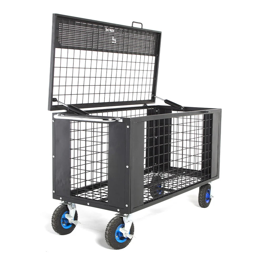 The Power Systems APEX Cage provides a high-functioning, mobile storage solution for fitness equipment and accessories. Designed for training facilities, boot camps, and multi-functional spaces, this ventilated steel cage keeps gear organized, secure, and easily accessible. Its durable black powder-coated steel construction, reinforced corners, and welded base ensure long-term reliability. Pneumatic, all-terrain wheels and a chrome steering bar allow effortless movement through doorways and around the facility. The hydraulic slow-close lid provides easy access while maintaining safety during use. With a 330 lb. capacity, the APEX Cage accommodates a variety of fitness gear, making it ideal for instructors and coaches managing group classes. Assembly is required, and the cage ships in two boxes.