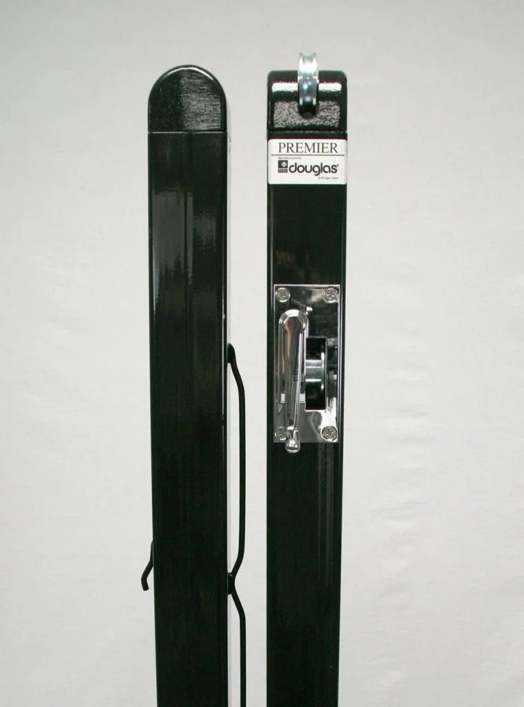 The Douglas® Premium Premier™ SQ Tennis Posts combine professional-grade strength with a classic square profile for a clean, polished look. Designed for both indoor and outdoor courts, these posts deliver the perfect mix of performance, style, and durability. Constructed from heavy-duty 11-gauge steel, they feature an internal wind system that ensures smooth net tensioning and long-term reliability. The black or forest green baked-on powder coat finish provides excellent rust resistance for years of dependable play.