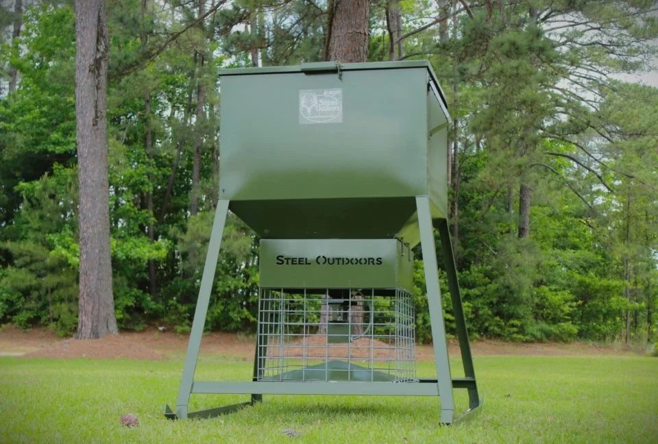 The Steel Outdoors 1000 LB Capacity Tank Automatic Spin Feeder is built for hunters and land managers who demand maximum durability and dependable performance. Constructed entirely from welded steel with protected internal components, this feeder is engineered to withstand harsh conditions and aggressive wildlife. Its low center of gravity enhances stability while skid style runners allow controlled relocation when empty. The programmable timer system provides up to six feed times per day, with adjustable run durations from 1 to 8 seconds for precise feed management. A reinforced cage design protects the spinner while allowing wide feed distribution. With standing height access to the timer and chest high filling convenience, this feeder combines strength, accessibility, and long term reliability.