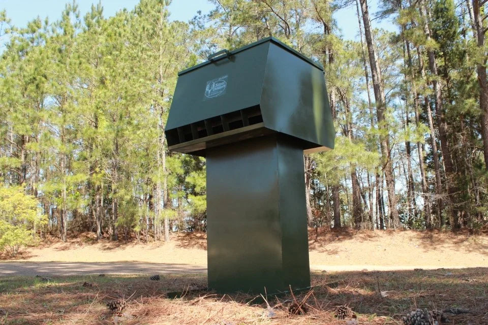 The Steel Outdoors 340 LB Bran Deer Feeder is built for serious feeding programs that demand durability and protection. Designed to handle bran style, pelletized, or kernel feed, including mixed blends, this gravity feeder delivers reliable flow across multiple feed types. A rugged skid platform with a boxed in, center mounted leg system provides exceptional stability in harsh outdoor environments. Five interior guard plates help prevent varmints from accessing the feed opening, reducing waste and protecting your investment. Built for land managers and hunters who need dependable performance, this feeder stands up to wildlife pressure and tough terrain. Whether managing deer populations or maintaining consistent feed sites, this unit is engineered for long term reliability.