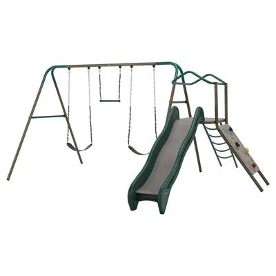 The Lifetime Climb & Slide Playset gives kids a fun and active way to enjoy the backyard with multiple ways to climb, swing, and slide. Featuring an 8 foot slide, climbing wall, rung ladder, two belt swings, and a trapeze bar, this all-in-one system keeps kids engaged for hours. The durable steel and blow molded plastic construction provides long lasting outdoor performance with minimal maintenance. Its earthtone color scheme blends naturally into any backyard while offering a clean, classic look. Designed for physical activity and imaginative play, this set is a great way to keep children moving, exploring, and having fun outdoors.