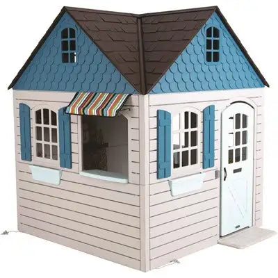 The Lifetime Imagination Playhouse gives kids their very own place to create, decorate, pretend, and explore. Children can arrange their space using reusable furniture stickers, placing chairs, tables, a fireplace, bookshelves, and more wherever they choose. With working doors, storefront windows, and a play sink with dishes and food, this cottage-style hideaway is packed with interactive features that spark creativity and role-play. Built with durable, weather-resistant materials, the playhouse withstands the elements and can be placed on grass, concrete, or any backyard surface. A protective roof and sturdy structure make this a fun and secure space for independent play and big imagination.