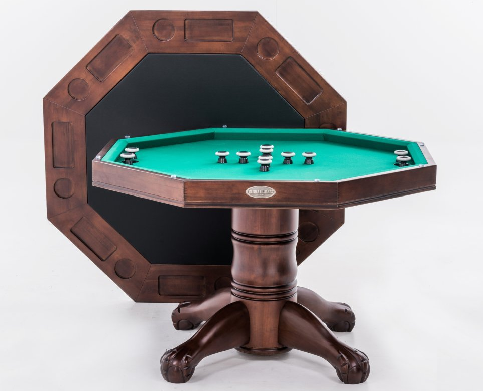 "The Boca" combines luxury design with versatile functionality, giving you three tables in one stunning centerpiece. With a quick flip of the top, this octagonal table transforms from an elegant dining surface to an 8-player poker table, complete with chip and drink holders. Remove the top to reveal a slate bumper pool table for even more fun.